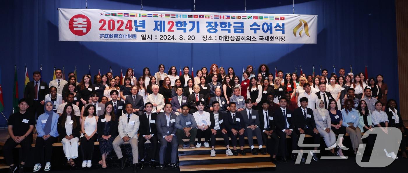 20일 오후 서울 중구 대한상공회의소에서 열린 2024년 2학기 외국인 유학생 장학금 수여식에서 이세중 이사를 비롯한 외국인 장학생들이 기념촬영을 하고 있다. 부영그룹의 우정교육문화재단은 이날 장학금 수여식을 열고 국내 대학에 재학 중인 외국인 유학생 33개국 99명에게 장학금 4억200만원을 기부했다. 우정교육문화재단은 지난 2008년 재단 설립 후 현재까지 15년째 국내 외국인 유학생에게 장학금을 지급해 오고 있다. 지금까지 아시아, 아프리카, 중남미 등 43개국 출신 외국인 유학생 총 2548명에 누적으로 100억원의 장학금을 지원했다. 2024.8.20/뉴스1 ⓒ News1 박지혜 기자