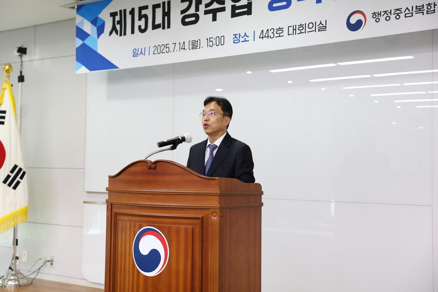 강주엽 신임 행정중심복합도시건설청장이 14일 정부세종청사에서 열린 취임식에서 발언하고 있다. (행정중심복합도시건설청 제공)관련 키워드행복청강주엽청장취임사행정수도세종시국가상징구역집무실조용훈 기자 평촌 선도지구 A-18, 특별정비구역 지정…재건축 인허가 절차 돌입김성은 주건협 회장 "민간공급 살리려면 PF·금융·세제 패키지 필요"관련 기사"대통령 세종 집무실·국회의사당 조성, 최대한 앞당긴다"[일문일답]행정·입법 공간과 시민 일상 잇는다…세종 국가상징구역 청사진 윤곽강주엽 행복청장 "내년 7월까지 국가상징구역 도시계획안 마련"최민호 시장 "대통령 집무실·세종의사당 조기 건립 전폭 지원"이 대통령 발언에 힘 받은 대통령 세종집무실…"2030년 완공"