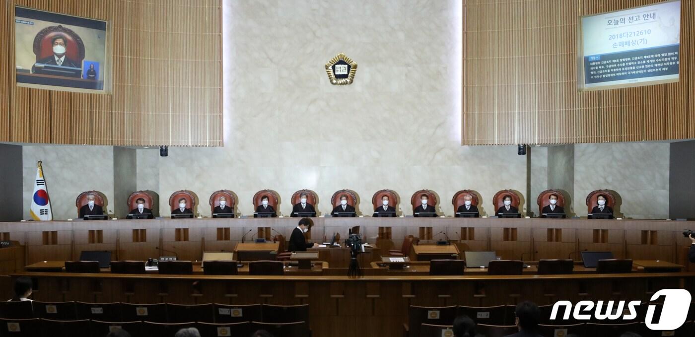 "9호 발령·수사·재판, 일련의 국가작용 '전체적'으로 판단"김명수 대법원장을 비롯한 대법관들이 30일 오후 서울 서초구 대법원에서 열린 전원합의체 선고를 위해 대법정에 배석해 있다. 2022.8.30/뉴스1 ⓒ News1 송원영 기자
