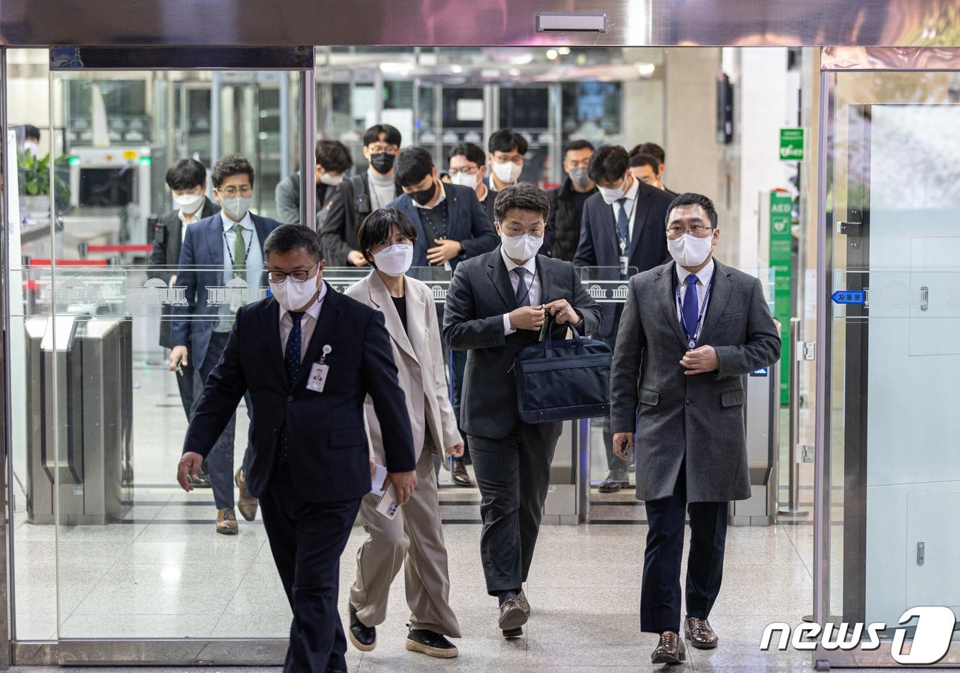 검찰 관계자들이 9일 오후 서울 여의도 국회 민원실에서 정진상 더불어민주당 당대표 정무조정실장 사무실을 압수수색 하기 위해 들어서고 있다. 2022.11.9/뉴스1 ⓒ News1 이재명 기자