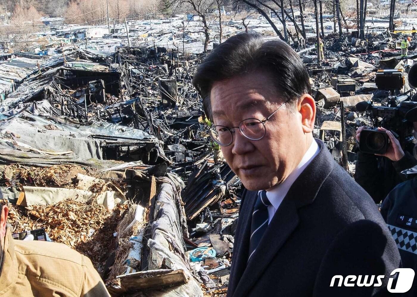 이재명 더불어민주당 대표가 20일 오후 화재가 발생한 서울 강남구 구룡마을 방문해 화재 현장을 둘러보고 있다. (공동취재) 2023.1.20/뉴스1 ⓒ News1 김도우 기자