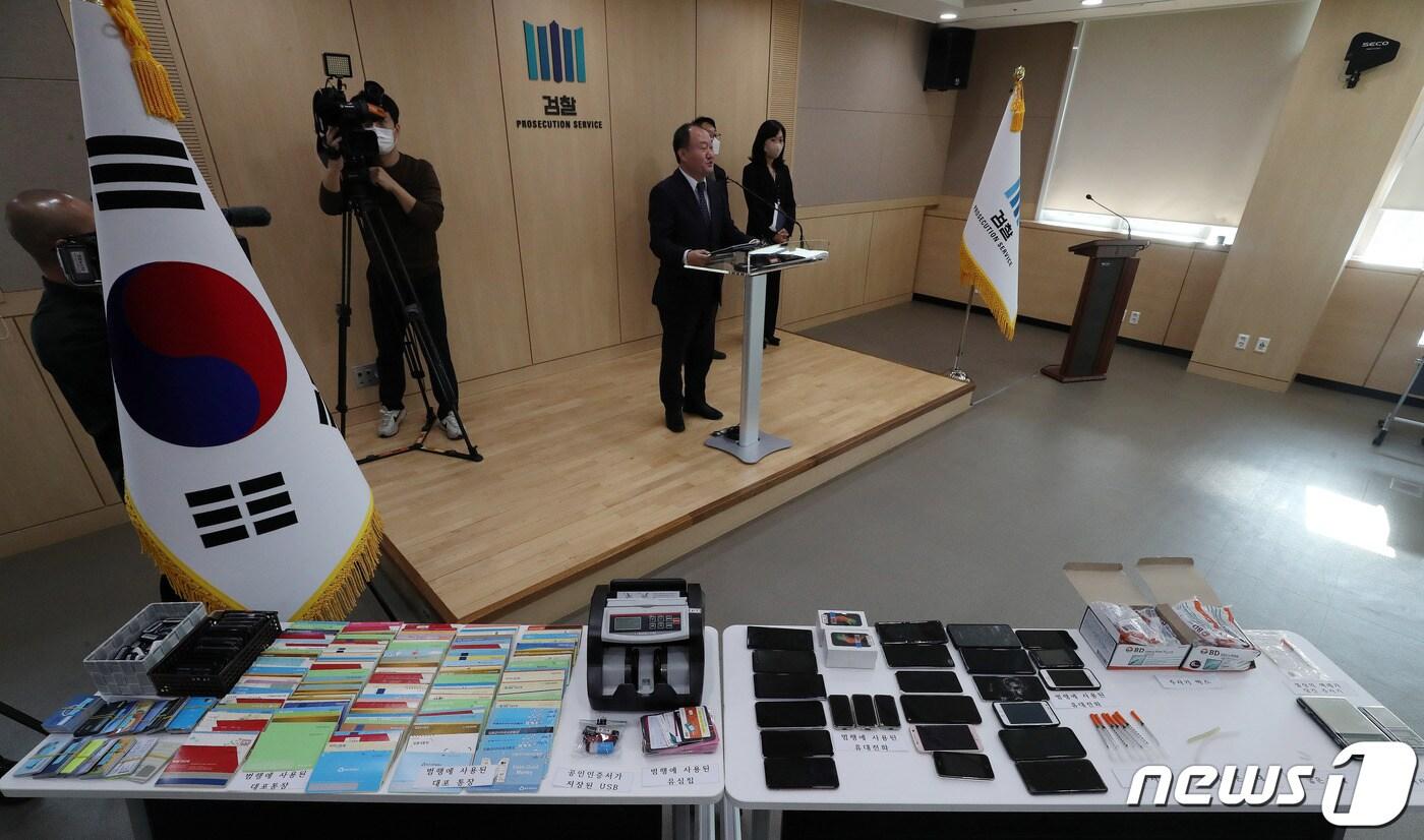 김호삼 보이스피싱 범죄 정부합동수사단 단장이 1일 오전 송파구 서울동부지방검찰청에서 조직폭력배와 마약사범이 연루된 보이스피싱 조직 수사결과를 발표하며 법죄에 사용된 압수품을 공개하고 있다.. 2022.12.1/뉴스1 ⓒ News1 박세연 기자