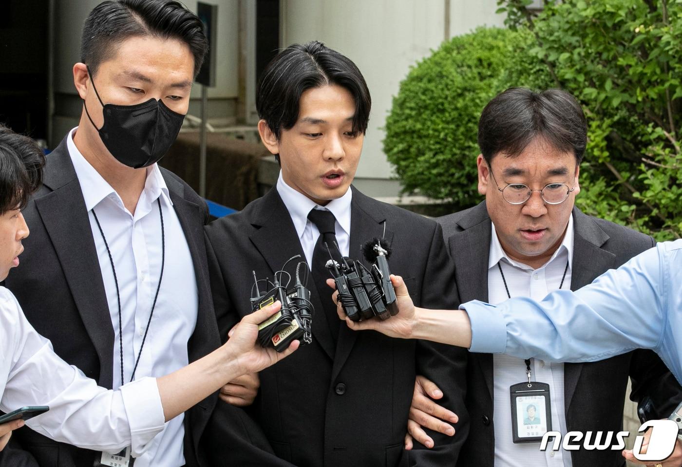 마약 상습 투약 혐의를 받는 배우 유아인(본명 엄홍식)이 24일 서울 서초구 서울중앙지방법원에서 열린 구속 전 피의자심문(영장실질심사)을 마치고 법원을 나서고 있다. 2023.5.24/뉴스1 ⓒ News1 김도우 기자