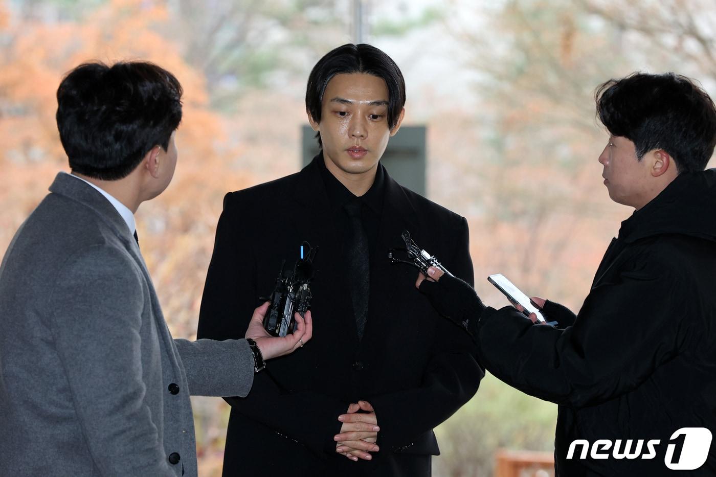 마약류 관리에 관한 법률 위반(향정) 등 혐의로 기소된 배우 유아인(본명 엄홍식)이 12일 오전 서울 서초구 중앙지법에서 열린 첫 공판에 출석하고 있다. 유아인은 프로포폴, 대마, 케타민, 코카인, 졸피뎀, 미다졸람, 알프라졸람 등 총 7종 이상의 마약 투약 혐의(마약류관리법 위반 등)를 받고 있다. (공동취재) 2023.12.12/뉴스1 ⓒ News1 유승관 기자