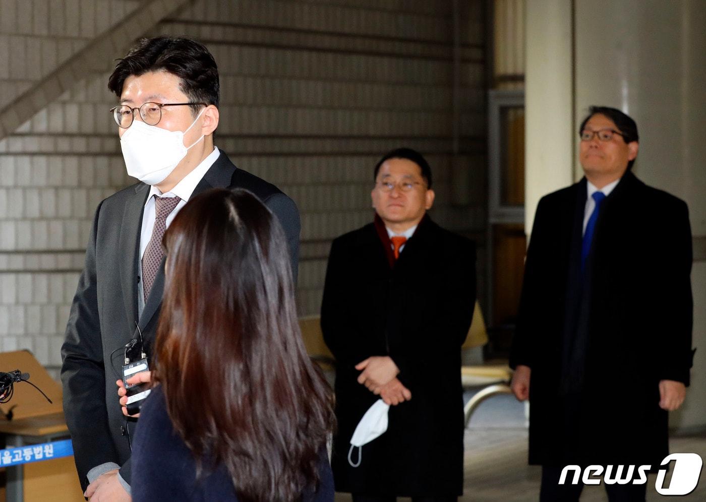 김학의 전 법무부 차관의 출국 시도를 불법으로 금지한 혐의로 재판에 넘겨진 이규원(왼쪽부터) 검사와 차규근 전 법무연수원 연구위원, 이광철 전 청와대 민정비서관이 15일 서울 서초구 서울중앙지법에서 열린 직권남용권리행사방해(직권남용) 관련 1심 선고 공판에서 판결 뒤 법원을 나와 발언하고 있다. (공동취재)2023.2.15/뉴스1 ⓒ News1 박세연 기자