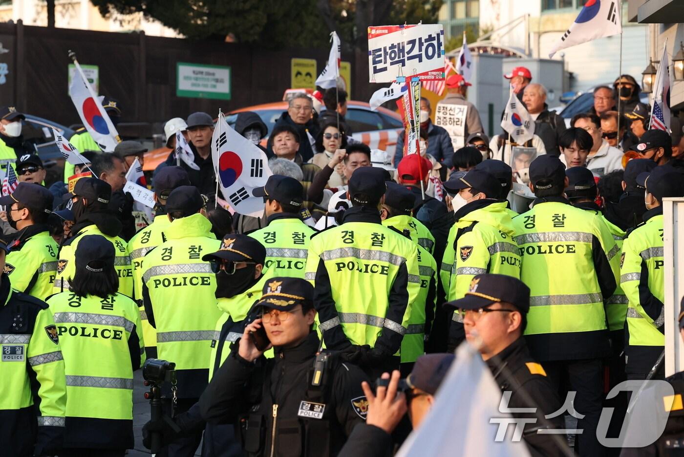 경찰이 20일 오후 서울 종로구 헌법재판소 앞에서 헌재 정문으로 이동하는 윤석열 대통령 탄핵 각하를 주장하는 시위대를 차단하고 있다. 2025.3.20/뉴스1 ⓒ News1 오대일 기자관련 키워드尹비상계엄선포헌재탄이세현 기자 尹측 "특검 결론 전제로 논리 구성…공수처 수사권 없다"법원 "공수처 수사권 인정"에…尹 '공소 기각' 카드 흔들