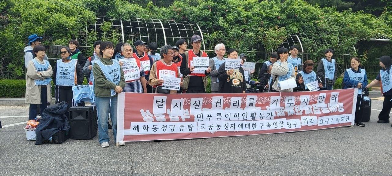"증거인멸·도주 우려 있다고 보기 어려워"5일 서울시 서초구 서울중앙지법 앞에서 전국장애인차별철폐연대 활동가들이 혜화동성당 종탑에서 고공농성을 벌이던 활동가 2명의 구속 영장 기각을 촉구하며 기자회견을 열고 있다. 2025.05.05/관련 키워드전장연혜화동성당고공농성영장실질심사권진영 기자 백해룡 "파견 종료하고 마약게이트 수사용 별도 공간 만들어 달라"최저 '-8도' 추위에 꽁꽁…"빙판길 조심하세요"[오늘날씨]관련 기사전장연 "혜화동성당 고공농성' 활동가 2명 구속영장 기각해야"'혜화동성당 고공농성' 전장연 활동가 2명 구속 기로혜화동성당 종탑 농성 15일 만에 종료…전장연 활동가 3명 체포전장연 활동가 혜화동성당 종탑서 고공농성…"탈시설 권리" 주장