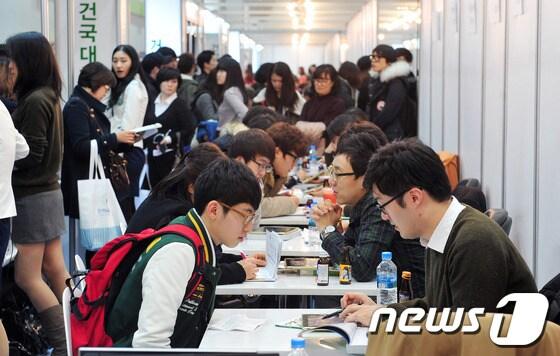 전문가들 "상위권大 최대 5점↓…하위권大 최대 15점↑"수능 성적 반영 방법 제각각…모집 요강 점검해야대학별 원서접수 마감시간 및 고사일정도 체크해야7일 서울 삼성동 코엑스에서 열린 '2014학년도 정시모집 대입 정보박람회'를 찾은 수험생들이 입학상담을 받고 있다. 뉴스1 © News1 한재호 기자