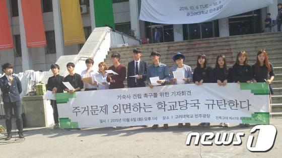 고려대학교 총학생회, 민달팽이 유니온 등 5개 단체는 6일 오후 1시쯤 서울 성북구 고려대 민주광장에서 규탄 기자회견을 열고 기숙사 신축을 다시 한번 촉구했다. 2015.10.6./뉴스1.ⓒ News1