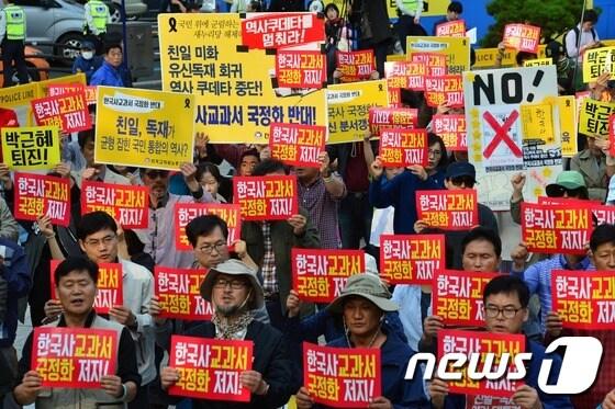 교육부 "정부 포상업무 지침 따른 정당한 조치"전교조 "교육부 횡포"반발전국교직원노동조합 회원들이 23일 오후 서울 종로구 보신각 앞에서 역사 교과서 국정화 저지 집회를 열고 구호를 외치고 있다. 2015.10.23/뉴스1 ⓒ News1 손형주 기자박정양 기자 [속보] 한동훈 "윤 대통령 오찬 초청, 건강상 이유로 사양"[속보] 김기현 "윤재옥 원내대표 중심으로 당 안정시켜 달라"