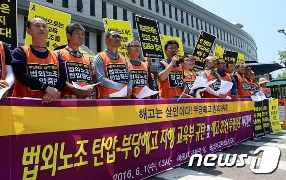 전국교직원노동조합 구성원들이 6월1일 정부세종청사 교육부 앞에서 '법외노조 탄압 및 부당해고 규탄, 교육부-고용노동부 규탄' 기자회견을 하고 있다./뉴스1 ⓒ News1 장수영 기자