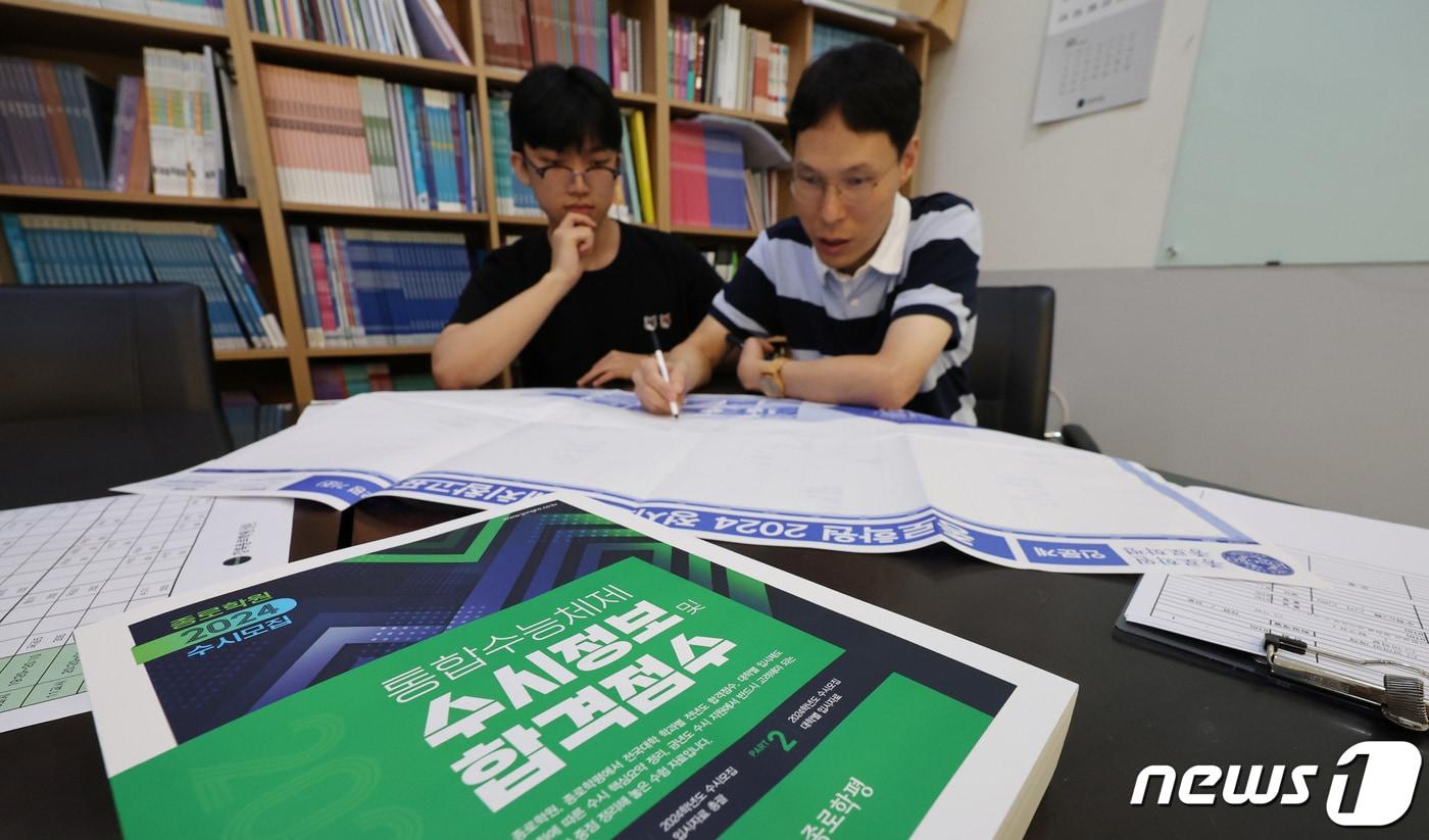 수능 9월 모평 가채점 결과…"국어·탐구 비중 커질 것"서울권 대학 진학 최저선 인문 193점·자연 200점 추정2024학년도 대학 입시 수시 원서접수 기간을 앞둔 7일 서울 강북종로학원에서 9월 모의평가를 치른 한 수험생이 선생님과 배치참고표를 보며 입시 상담을 하고 있다. 2023.9.7/뉴스1 ⓒ News1 박지혜 기자2024학년도 9월 모의평가 주요대학, 학과 정시지원 가능선(가채점 기준). (종로학원 제공)관련 키워드종로학원9월모평2024대입2024수시서한샘 기자 尹 '체포방해' 1심 징역 5년…특검 "일부 무죄 면밀 검토할 것"(종합2보)尹 첫 선고 '계엄 위헌' 우회 지적…내달 내란 재판 가늠자 되나