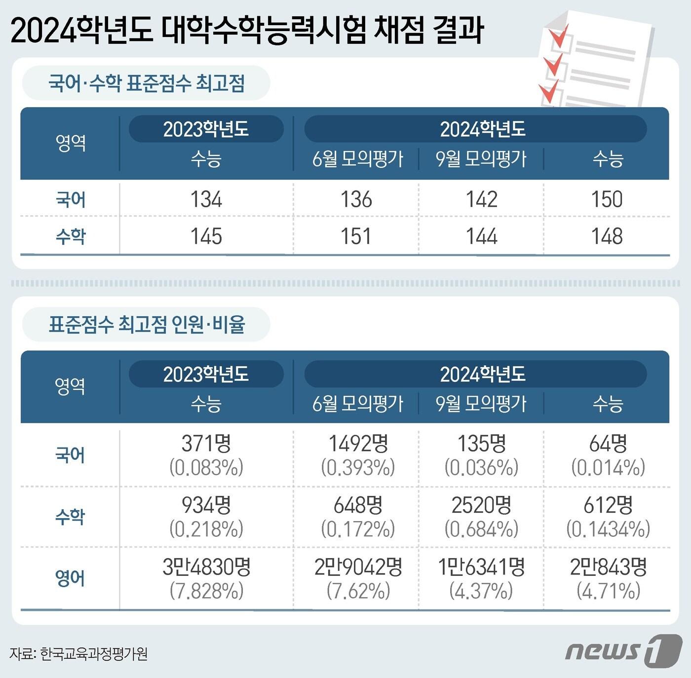 수능 출제기관인 학국교육과정평가원이 7일 정부서울청사에서 발표한 '2024학년도 수능 채점 결과'를 보면 국어의 표준점수 최고점은 2019학년도와 같은 150점이었다. 수학의 표준점수 최고점은 지난해 수능(145점)보다 3점 상승한 148점으로 지난 2022학년도 수능(147점)과 비슷했다. 지난 6월 모의평가(151점)보다는 소폭 난도가 하락했고 9월 모평(144점)보다는 상승했다. ⓒ News1 김지영 디자이너