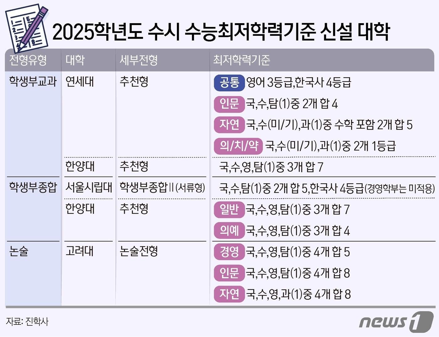 교과전형 수능 최저기준 신설·확대 대학 늘어나"수능 집중 학생 증가할 듯…집중도 분산 양상"ⓒ News1 양혜림 디자이너관련 키워드대입뉴스1수능대학수능수능교육부교육청연세대관련 기사서울교대 수시 60% 미충원…전국 교대 정시경쟁률은 5년來 최고(종합)서울교대, 수시에서 60% 선발 못 해…높은 최저, 불수능 영향정근식 "국교위 혁신안 깊이 공감…사회적 논의 속도 내야"수능 절대평가, 서·논술형 도입 추진?…국교위, 대입 개편 논의 시동경북교육청, 모의평가·AI 진학설계로 수능·대입 경쟁력 높인다