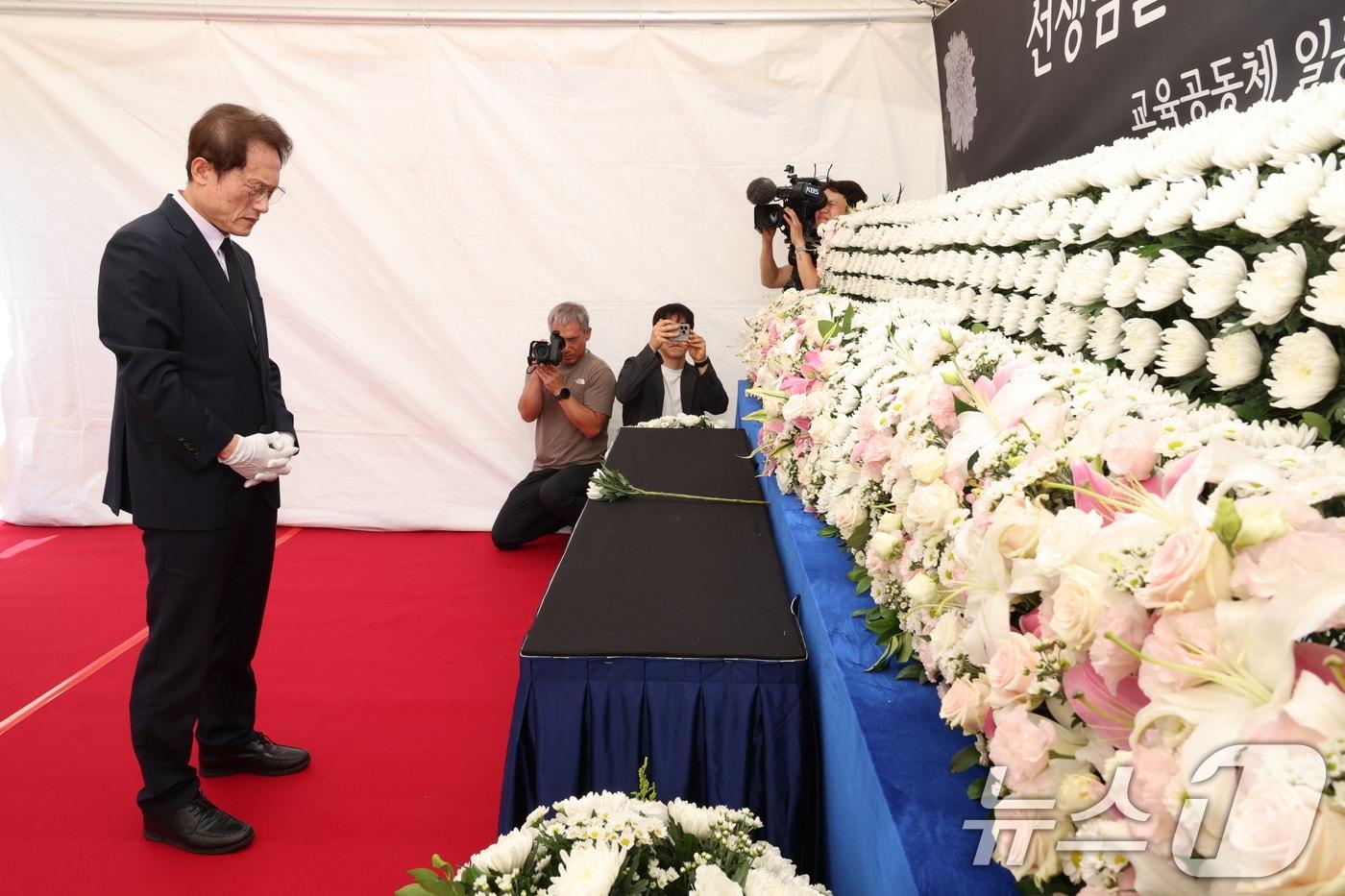 "교권 5법 한계…교권 보호 3법 추가 제·개정 제안"조희연 서울시교육감이 15일 서울 종로구 서울시교육청에 마련된 서이초 교사 사망 1주기 추모 공간에서 묵념하고 있다. (서울시교육청 제공) 2024.7.15/뉴스1관련 키워드조희연서울시교육감서이초서이초1주기조희연교육감