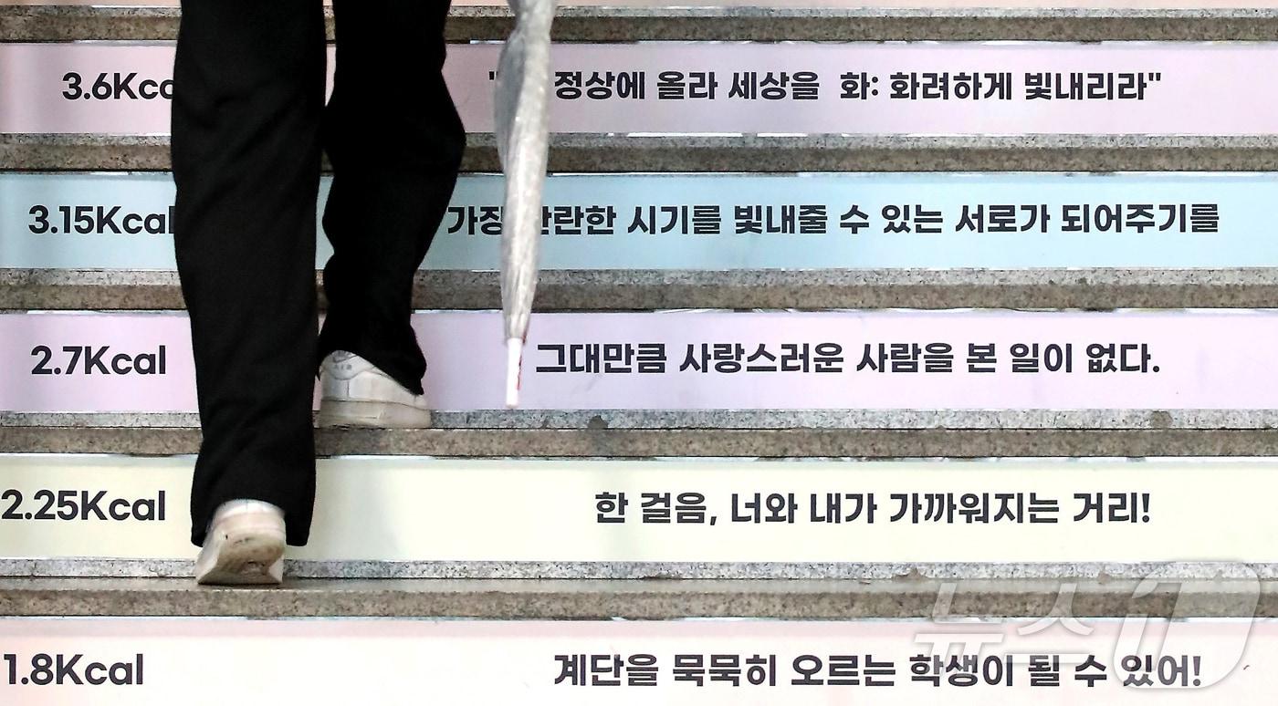 2025학년도 대학수학능력시험을 30일 앞두고 전국연합학력평가가 치러진 15일 대구 수성구 정화여고에서 학생들이 응원 표어가 붙은 중앙계단을 올라가고 있다. 정화여고는 '정화 계단 표어 공모전'을 통해 학교폭력 예방, 학교생활 중 행복과 희망, 친구 응원 등의 메시지를 담은 표어를 중앙계단에 붙여 학생들을 응원한다. 2024.10.15/뉴스1 ⓒ News1 공정식 기자