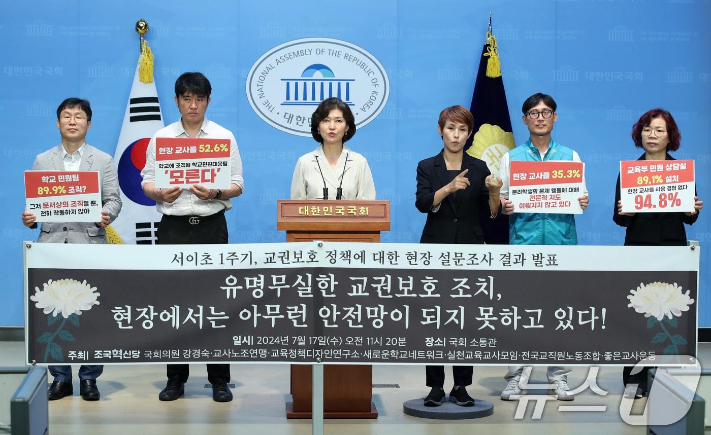 생활지도 고시에도 학생 불응할 경우 실질적 효과 없어"문제 학생 치료 권하고 물리적 제지 가능 법 통과돼야"강경숙 조국혁신당 의원과 교육 6단체가 17일 오전 서울 여의도 국회 소통관에서 '서이초 1주기, 교권보호 정책 실효성 평가 설문조사 결과 발표' 기자회견을 하고 있다. 2024.7.17/뉴스1 ⓒ News1 이광호 기자관련 키워드뉴스1국회교육위교육부교사교총관련 기사학폭 가해자, 명문대 못 간다…서울 주요 대학서 99% 탈락 시켜교육감협 "행정통합 특별법 제정 때 교육자치 보장해야"과학고·영재학교 출신 'N수생' 국립의대 진학, 5년 연속 증가與, 공직선거후보자 추천관리위 설치…위원장 김이수 전 헌재소장[프로필] 문정복 與 신임 최고위원…선거운동원서 당 지도부까지