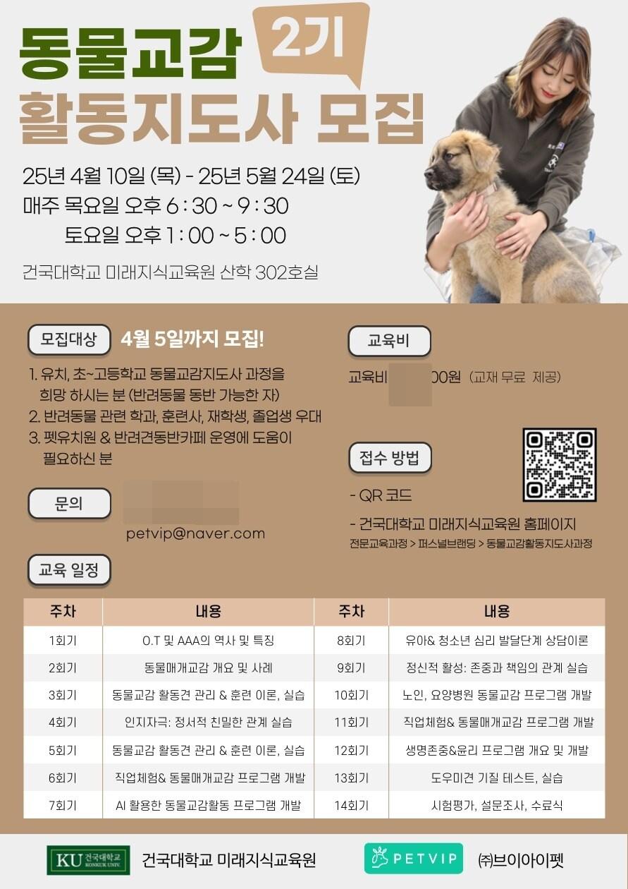 브이아이펫, 4월5일과 12일까지 수강생 모집 계획건국대 미래지식교육원 '동물교감활동지도사 2기' 모집 포스터(브이아이펫 제공) ⓒ 뉴스1건국대 미래지식교육원 '펫매니저 전문가과정' 모집 포스터(브이아이펫 제공) ⓒ 뉴스1관련 키워드펫교육행사동물반려동물최서윤 동물문화전문기자 김영기 더본외과동물의료센터 원장, 대만서 관절 치료법 교육고양이수의사회, 2월28일 학술대회…내시경실습·냥학퀴즈왕 진행한송아 기자 고양이수의사회, 2월28일 학술대회…내시경실습·냥학퀴즈왕 진행건국대 반려동물·사회복지 융합과정, 2월7일 입학설명회·세미나 개최관련 기사건국대 반려동물·사회복지 융합과정, 2월7일 입학설명회·세미나 개최"크리스마스엔 난지한강공원 반려동물캠핑장으로"…이벤트도 실시동물 심장초음파, 임상 적용 방법은…아이해듀, 12월 교육 개최수의응급중환자의학회, 12월 유한양행서 세미나…문정희 북콘서트도스카이동물메디컬센터–삼천당제약, 메가주서 특별 구강검진 이벤트