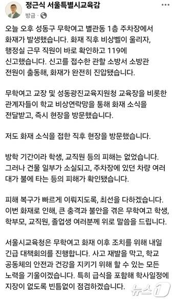 무학여고 급식실 건물서 화재…인명 피해 없어"사고 재발 막고 학사 일정에 지장 없도록 점검"정근식 서울시교육감 페이스북 갈무리.(서울시교육청 제공)관련 키워드정근식서울시교육청무학여고무학여고화재장성희 기자 이화여대, 큐어버스와 '맞손'…신약 공동 연구·개발학생이 질문 만들고 데이터 분석…서울 수학·과학·융합교육 추진관련 기사정근식 "사립학교 법정부담금 지원 정책, 전면 재점검 필요"화재 발생 무학여고, 입학·졸업식 정상 진행…운반 급식 전환