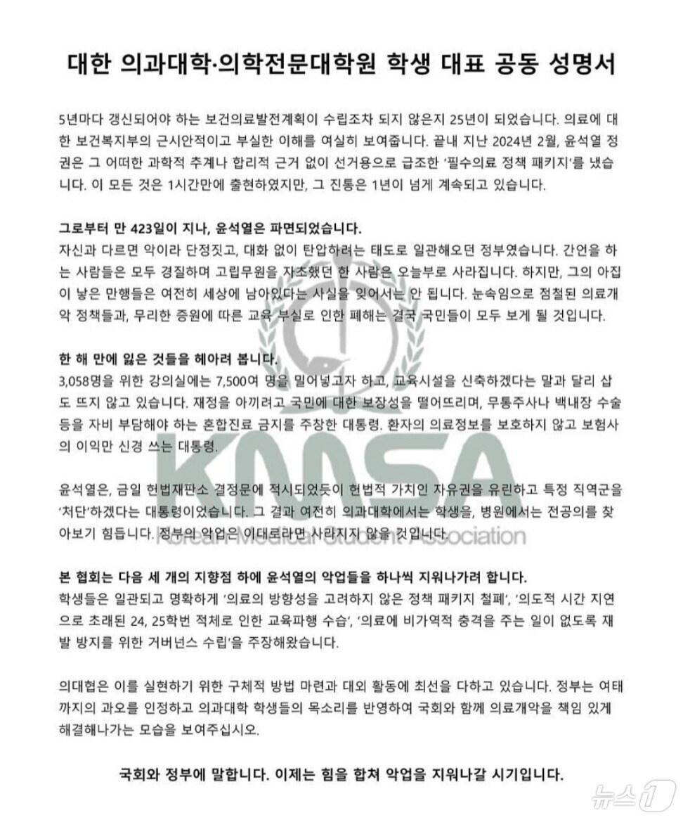 [尹탄핵인용] 의대협 "힘 합쳐 악업 지워나갈 시기"대한의과대학·의학전문대학원학생협회(의대협) 제공관련 키워드의대협뉴스1윤석열탄핵윤석열파면의대증원관련 기사박단 "사태 여전히 막막…앞으론 새 정부와 전향적으로 대화, 소통"'자체설문·정치권 만남'…의대생·전공의 복귀 움직임 본격화의대생들 "의료개악 끝나지 않았다…의료 파괴한 자에 책임 물어야"[단독] 전국 40개 의대생 대표, 자퇴 결의…"제적생 나오면 실행"이주호 "4월 말 이전 의대생 대화 통해 복귀 계기 마련"