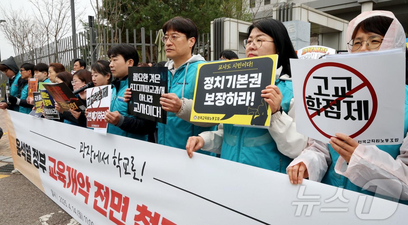 전국교직원노동조합 조합원들이 지난달 14일 세종시 정부세종청사 교육부 앞에서 윤석열 정부 교육개악 전면 철폐 투쟁선포 기자회견을 열고 늘봄학교, 고교학점제, AI 디지털 교과서 등 윤석열 정부의 교육정책 철회를 요구하고 있다. 2025.4.14/뉴스1 ⓒ News1 김기남 기자