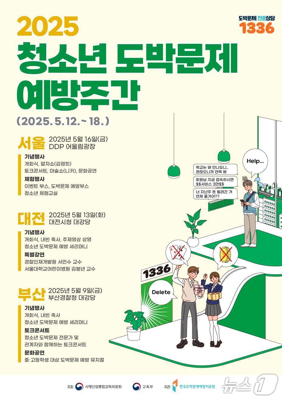 교육부·사감위, 12~18일 예방주간기념행사·캠페인·체험행사 등 마련교육부 제공관련 키워드교육부청소년도박사행산업통합감독위원회사감위권형진 기자 관훈클럽, 13일 이석연 국민통합위원장 초청 토론회해방 후 첫 '한국여성사' 집필…최숙경 이화여대 교수 별세관련 기사"불법도박 100조, 청소년 도박 22배 폭증…여야 "포기했나" 질타"호기심이라도 절대 안돼" 청소년 불법도박 예방캠페인 열려"청소년 도박은 중독"…마사회, 청소년 도박문제 예방주간 동참