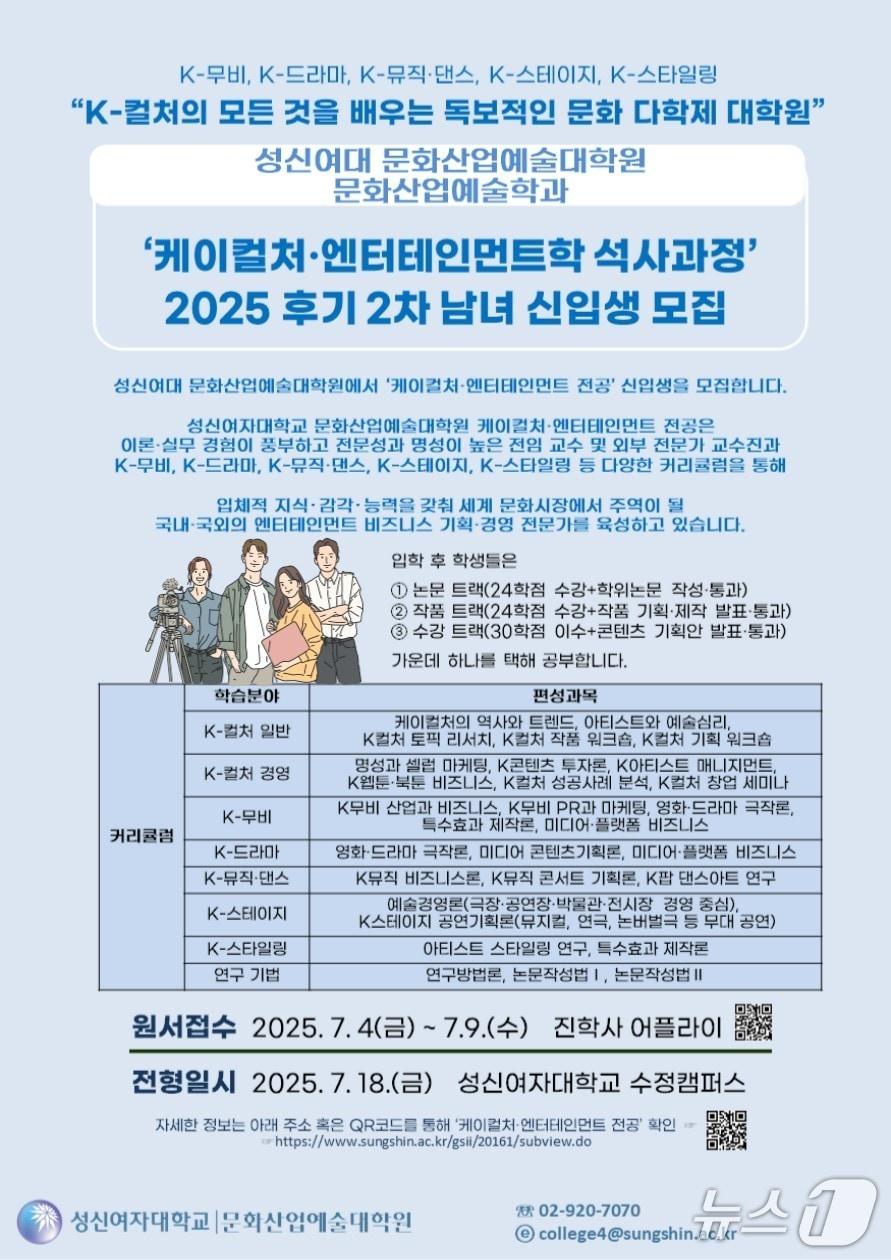 성신여대 문화산업예술대학원 케이컬처·엔터테인먼트학 석사과정 모집 포스터. (성신여대 제공)관련 키워드성신여대성신여대문화산업예술대학원권형진 기자 사립대 적립금, 얼마나 꺼내 썼나…'재정통계연보' 발간관훈클럽 총무에 이하원 조선일보 외교안보 에디터관련 기사성신여대, 융합산업대학원 신설…로컬디자인정책학·드라마예술전공 개설[인사] 성신여대"내 도전" 아이키, 공연에 육아에 석사까지…열정에 응원 [N이슈]