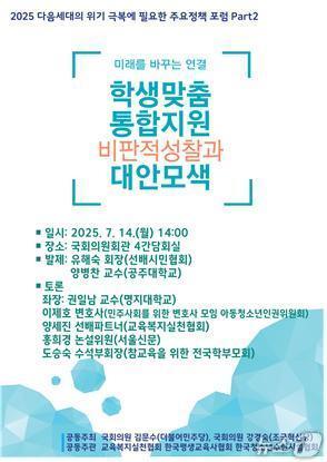 국회서 학생맞춤통합지원법 정책포럼학생맞춤 통합지원 비판적 성찰과 대안모색 주제로 열린 정책 포럼 포스터.이훈철 기자 이상돈 교수 "내란척결 몰두 좋지 않아…사법개혁 위해 2심 강화해야""소송보다 중재 활용" 민관 한 목소리…전문성·공정성 강화 지적도