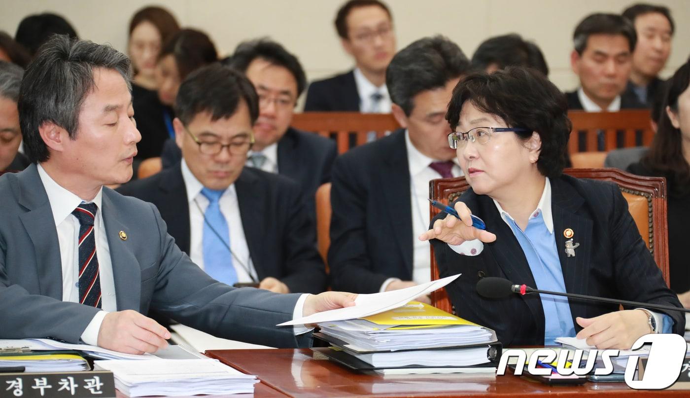 김은경 환경부장관이 14일 오후 서울 여의도 국회 본청에서 열린 환경노동위원회 전체회의에 출석해 안병옥 환경부 차관과 논의를 하고 있다. 2018.3.14/뉴스1 ⓒ News1 이동원 기자