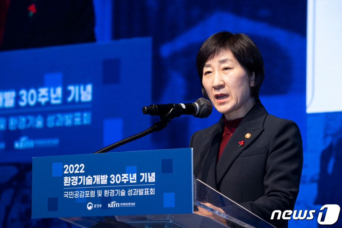 한화진 환경부 장관이 8일 오후 서울 강남구 한국과학기술회관에서 열린 환경기술개발 30주년 기념식에 참석해 기념사를 하고 있다. (환경부 제공) 2022.12.8/뉴스1