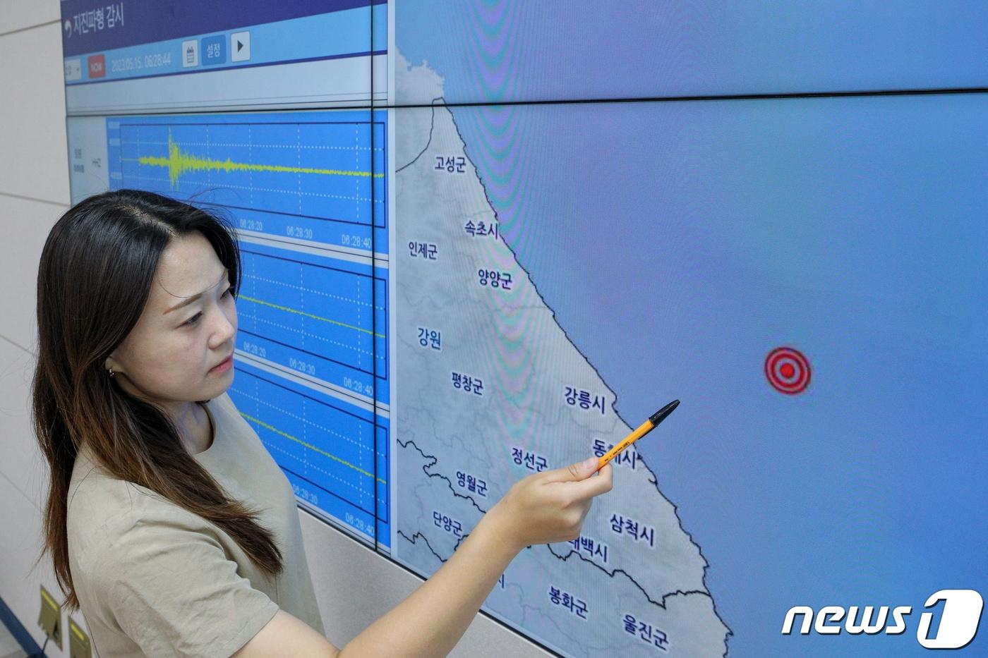 강원 동해 북동쪽 약 52km 부근 해역에서 규모 4.5 지진이 발생한 15일 서울 동작구 기상청 브리핑룸에서 직원이 지진 발생 지점을 가리키고 있다. 이날 오전 6시27분 발생한 지진은 지진 계기관측이 시작된 이래 역대 22번째로 강했으며 올해 한반도에서 발생한 지진 중 규모가 가장 컸다. 2023.5.15/뉴스1 ⓒ News1 안은나 기자