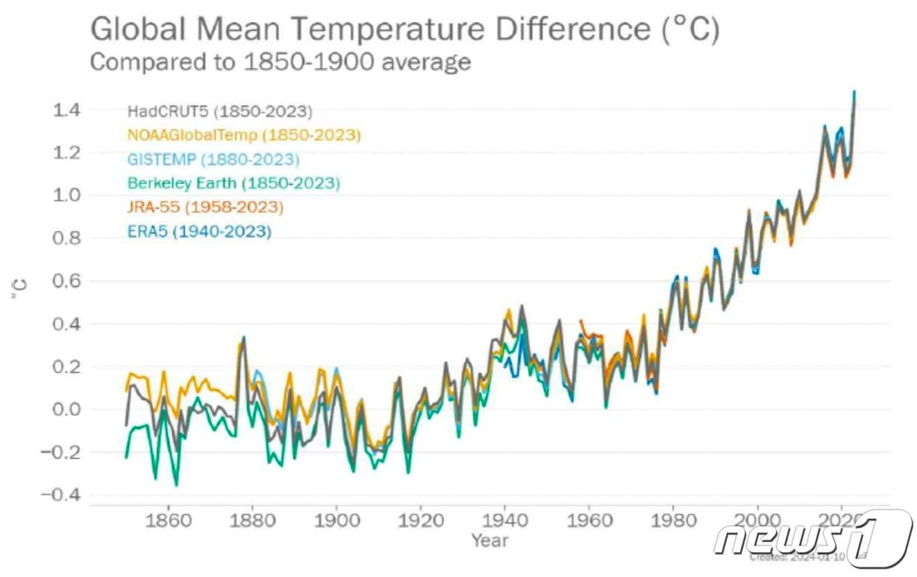 세계기상기구, 2023년 연평균 기온상승 1.45도 공식화1850~1900년 평균 온도와 1850~2023년 전 지구 평균 온도의 차(세계기상기구 제공)관련 키워드기후변화환경climatechangeweather황덕현 기후환경전문기자 김성환 기후장관 "수도권매립지 인천 이관, 지방선거 뒤 결론"기후장관, 尹정부 기후댐·4대강보 질책…"불필요한 댐, 과학으로 걸러야"관련 기사2050년 성탄절 트리 한반도서 멸종…21세기말 산불 위험은 2.5배아모레퍼시픽, CDP 기후변화·수자원 관리 부문 모두 최고 등급 A 획득"2050 탄소중립 달성"…서울시, 기후행동계획 포럼 개최전남도, '유엔기후변화협약 기후주간' 여수 유치 잰걸음기후변화학회, 학술플랫폼 SCOPUS 등재…다음주엔 부산서 학술대회