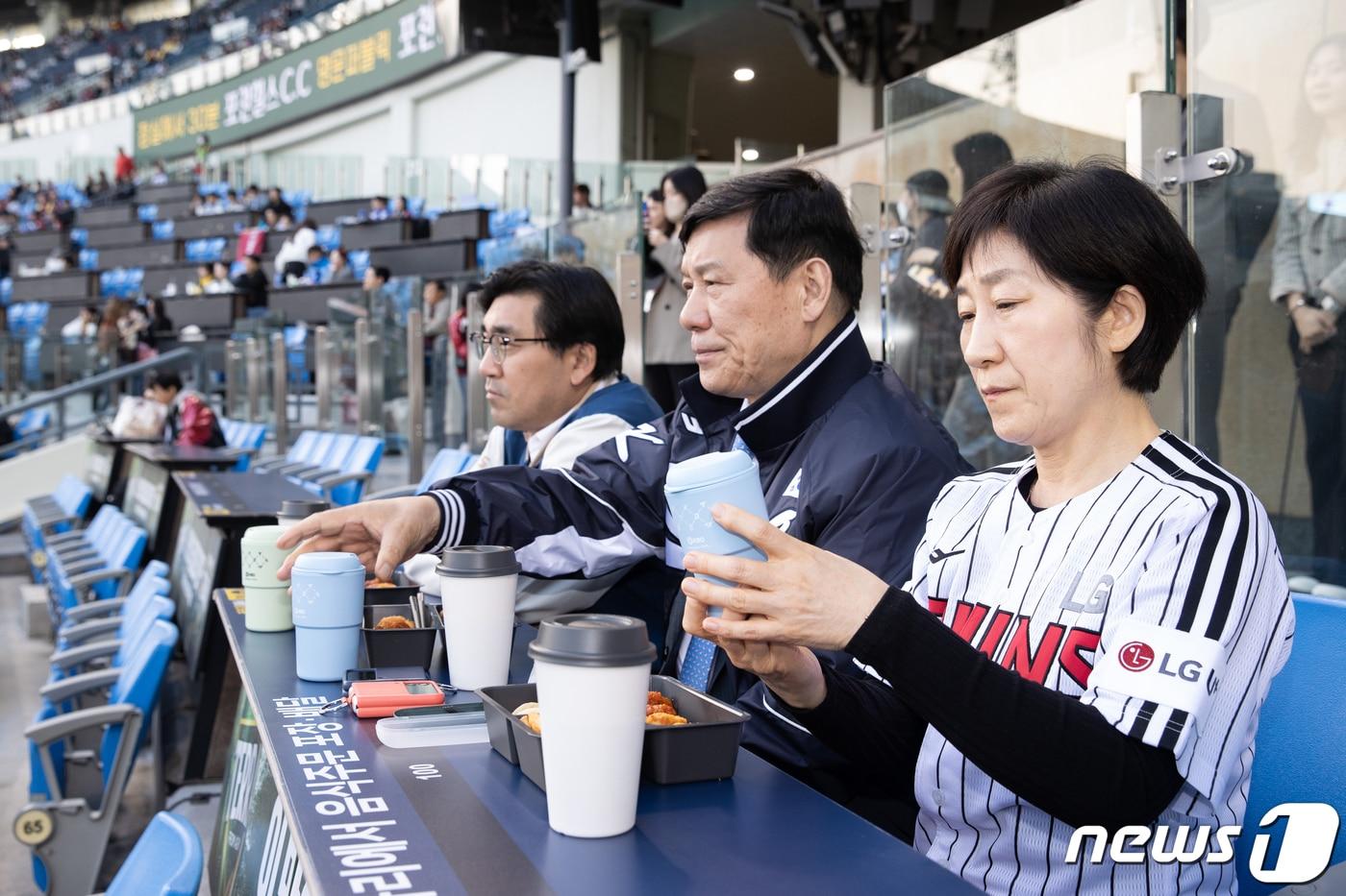 한화진 환경부 장관(오른쪽)이 서울 잠실야구장에서 KBO·프로야구 구단과 함께 ‘일회용품 없는 야구장 조성을 위한 자발적 협약’을 체결한 후 다회용기에 담긴 간식을 먹으면서 허구연 KBO총재와 야구 경기를 관람하고 있다. (환경부 제공) 2023.4.18/뉴스1
