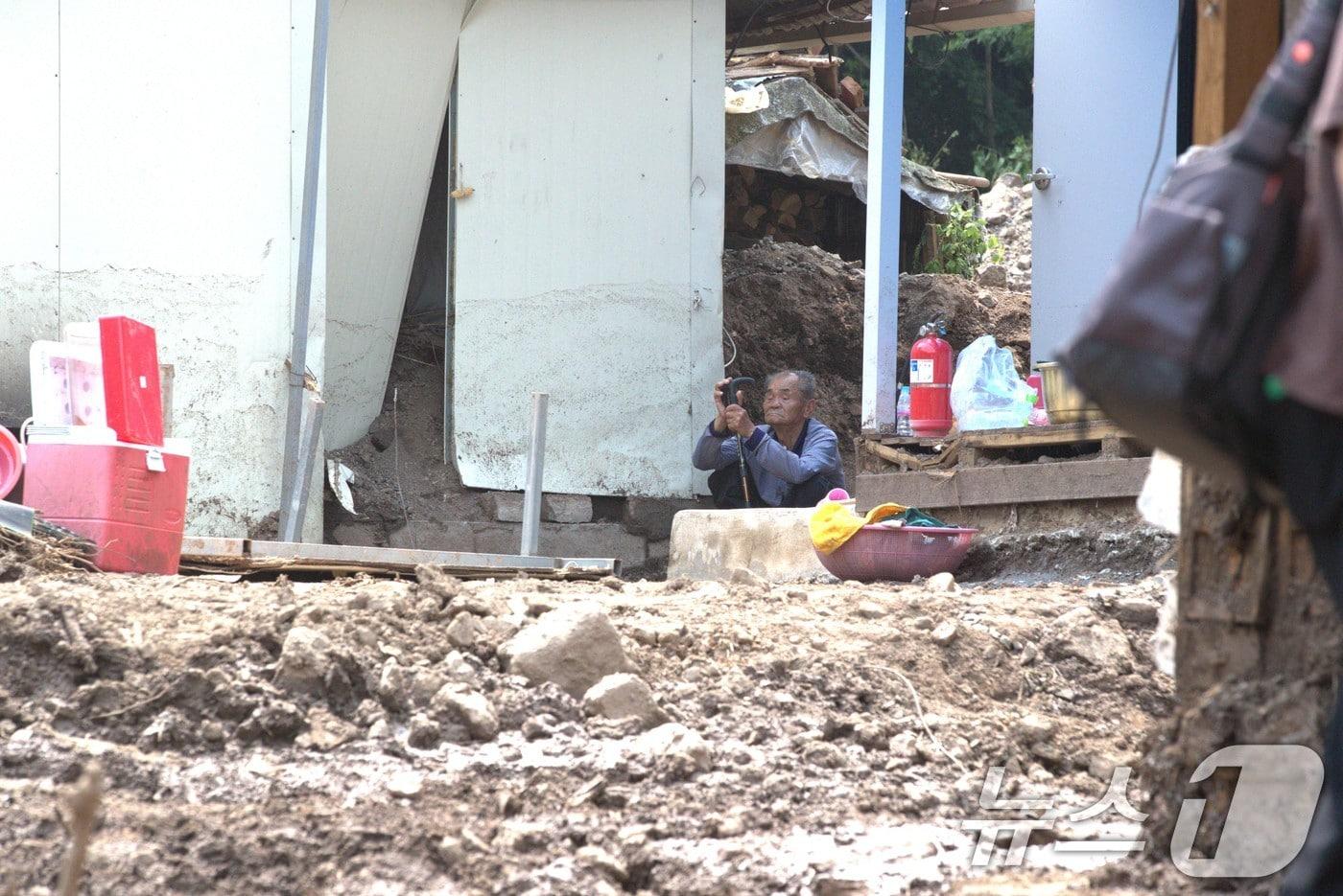 12일 오후 경북 영양군 대천리와 금학리 마을에서 폭우로 인한 복구작업을 90대 마을 주민이 바라보고 있다.2024.7.12/뉴스1 ⓒ News1 신성훈 기자