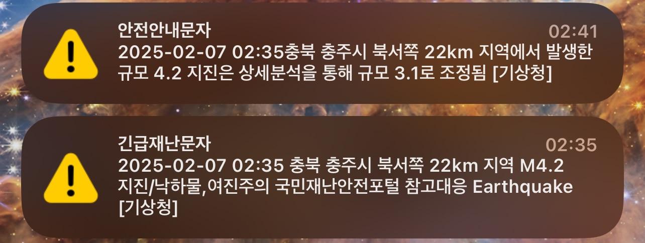 지진 규모 4.0 이상은 알림소리와 함께 전국에 긴급재난문자"타 지역 재난 알림은 자율 설정할 수 있게 해야" 목소리도7일 오전 스마트폰 화면에 전국에 발송된 재난문자가 떠 있다. 2025.02.07/ⓒ 뉴스1 김민수관련 키워드폭설지진충주서울권진영 기자 '천호동 흉기살인' 60대男, 첫 재판서 "보복 목적 아니었다"구룡마을 화재 8시간 28분만에 '완진'…이재민 약 190명 발생(종합4보)관련 기사"내복 바람으로 뛰쳐나와·폭탄 터지는 줄" 충주 진앙지 주민들충북도 "지진·폭설 피해 없도록" 대응체계 가동