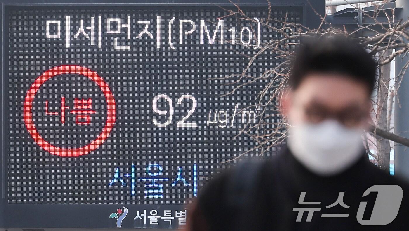 [내일날씨] 낮 최고 17도 '포근'…수도권·강원·제주엔 한때 비아침 최저 0~8도·낮 최고 10~17도황사가 유입돼 수도권 곳곳이 미세먼지 농도 '나쁨' 수준을 보인 26일 오전 서울시청 인근 전광판에 미세먼지 나쁨 안내방송이 나오고 있다. 2025.2.26/뉴스1 ⓒ News1 김성진 기자관련 키워드환경부기상청날씨weatherclimate황덕현 기후환경전문기자 수도권 쓰레기 충청행 논란 속…충주맨의 기후 행보 [황덕현의 기후 한 편]미세먼지 토요일 낮부터 해소…동쪽 '건조'·곳곳 '블랙아이스'(종합)관련 기사내일 오전까지 곳곳 짙은 미세먼지…일교차 크고 아침엔 영하권"앞이 안 보이네"…초미세먼지·안개 겹쳐 가시거리 40m인 곳도내일 미세먼지 탁하고 포근…오전엔 안개, 동쪽 '건조'(종합)내일 중부·전라 오전에 눈·비…오후엔 수도권·충청 미세먼지 악화(종합)내일 기온 회복, 곳곳 오전까지 눈·비…도로살얼음에 '운전 유의'