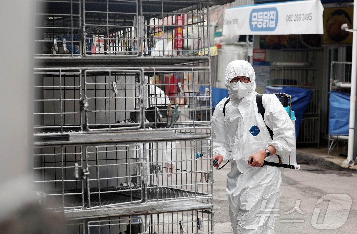 21일 광주 북구청 시장산업과 동물정책팀 직원들이 관내 한 재래시장 닭오리 판매업소에서 조류인플루엔자 예방을 위해 긴급 방역을 실시하고 있다.(광주 북구 제공. 재판매 및 DB 금지) 2025.5.21/뉴스1 ⓒ News1 박지현 기자
