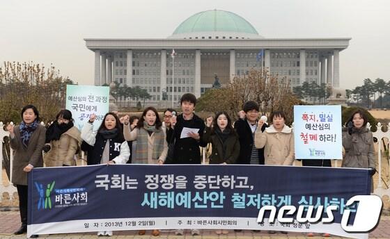 "11년째 시한 넘겨…서민 위해 국회 정상화해야" 비판바른사회시민회의 회원들이 2일 오전 서울 영등포구 국회의사당 정문 앞에서 열린 기자회견에서 국회의원들의 정쟁 중단과 새해예산안 심사를 촉구하는 구호를 외치고 있다. 2013.12.2/뉴스1 © News1 박철중 기자