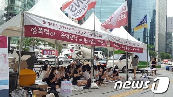여성단체 "SNS기업, 여성 인격권 보호하라"18일 오후 서울 강남역에서 여성단체 '디지털 성범죄 아웃' 소속 여성들이 "SNS 기업은 온라인의 디지털 성범죄로부터 여성들을 보호하라"며 구호를 외치고 있다. 2017,8.18/뉴스1 ⓒ News1