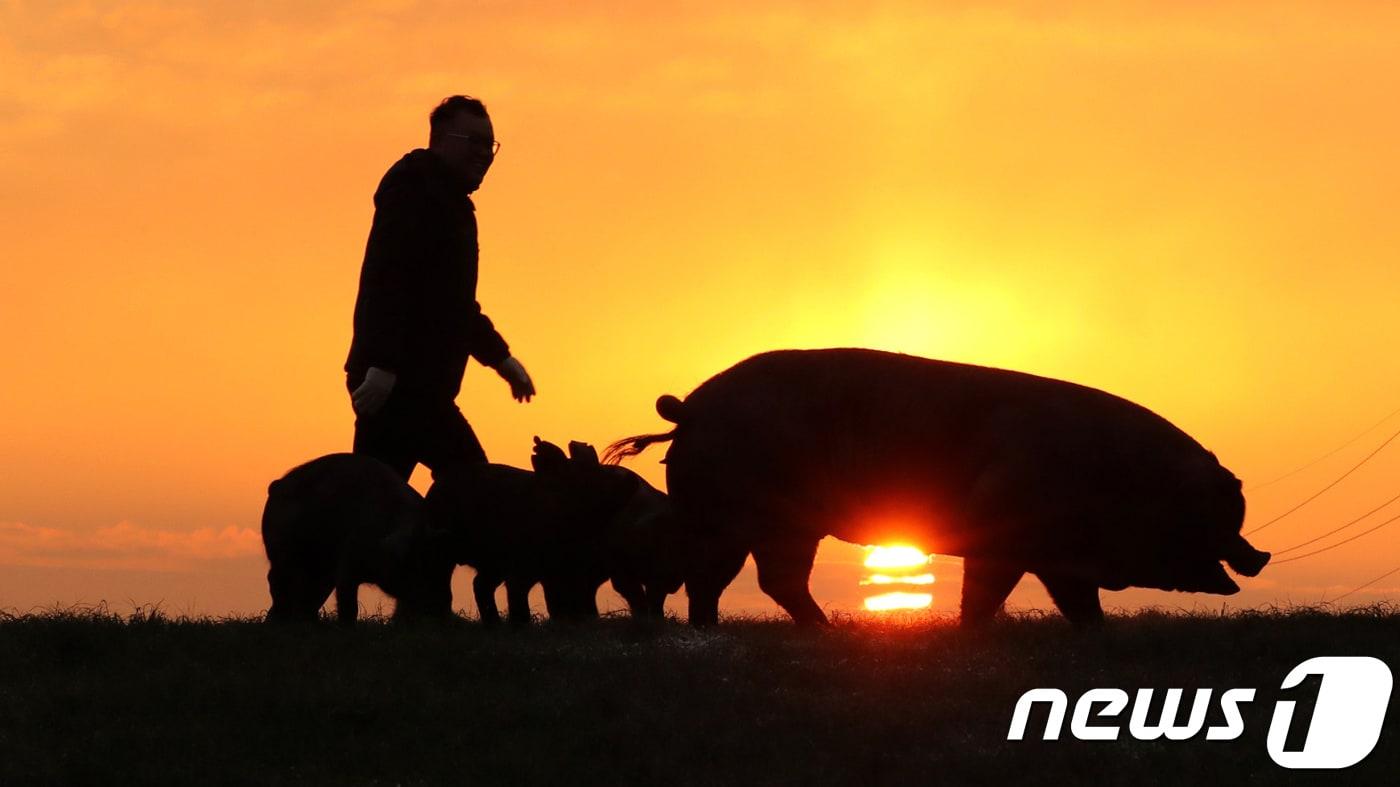'돼지의 해'인 2019년 기해년(己亥年)이 밝았다. 돼지들이 떠오르는 새해 태양을 뒤로 한 모습. 2019.1.1/뉴스1 ⓒ News1 장수영 기자