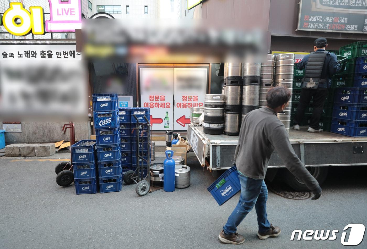서울의 한 유흥거리에서 관계자가 맥주 박스를 옮기고 있다. 2021.10.25/뉴스1 ⓒ News1 이성철 기자
