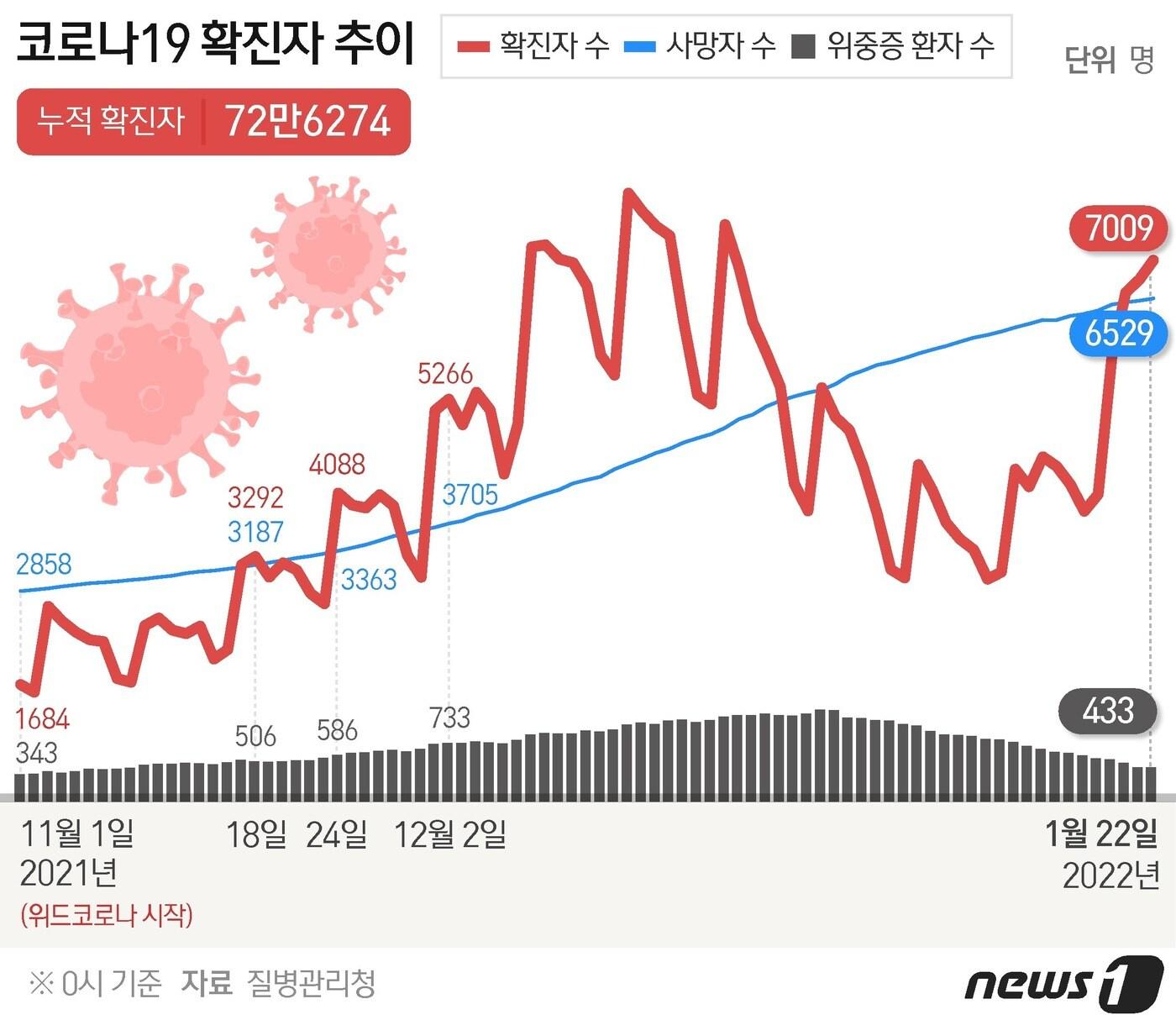 2주전 대비 2배 가량 급증…지역발생 주평균 5160명위중증 433명, 소폭 반등…3차 접종률 48.6%ⓒ News1 이지원 디자이너질병관리청 중앙방역대책본부(방대본)는 22일 0시 기준 신종 코로나바이러스 감염증(코로나19) 신규 확진자가 7009명 발생했다고 밝혔다. ⓒ News1 이지원 디자이너ⓒ News1 이지원 디자이너관련 키워드코로나19신종코로나이형진 기자 니혼슈코리아, 한일정상회담 개최지역 대표 사케 3종 선보여bhc, '콰삭킹' 출시 1년 앞두고 누적 판매 700만개 돌파관련 기사2024년 재난 사망·실종 387명…재산피해 1조418억 달해스포츠산업 매출액 '84조7000억원' 역대 최대…종사자 46만명팬데믹 위기 대비 '백신 신속도입 범정부 협의체' 설치된다"코로나19 확산 대응 못한 죄?"…전 中우한시장 당적·공직 박탈다시 화두 오른 '고령자 운전'…"운전면허 반납제 지원 확대해야"