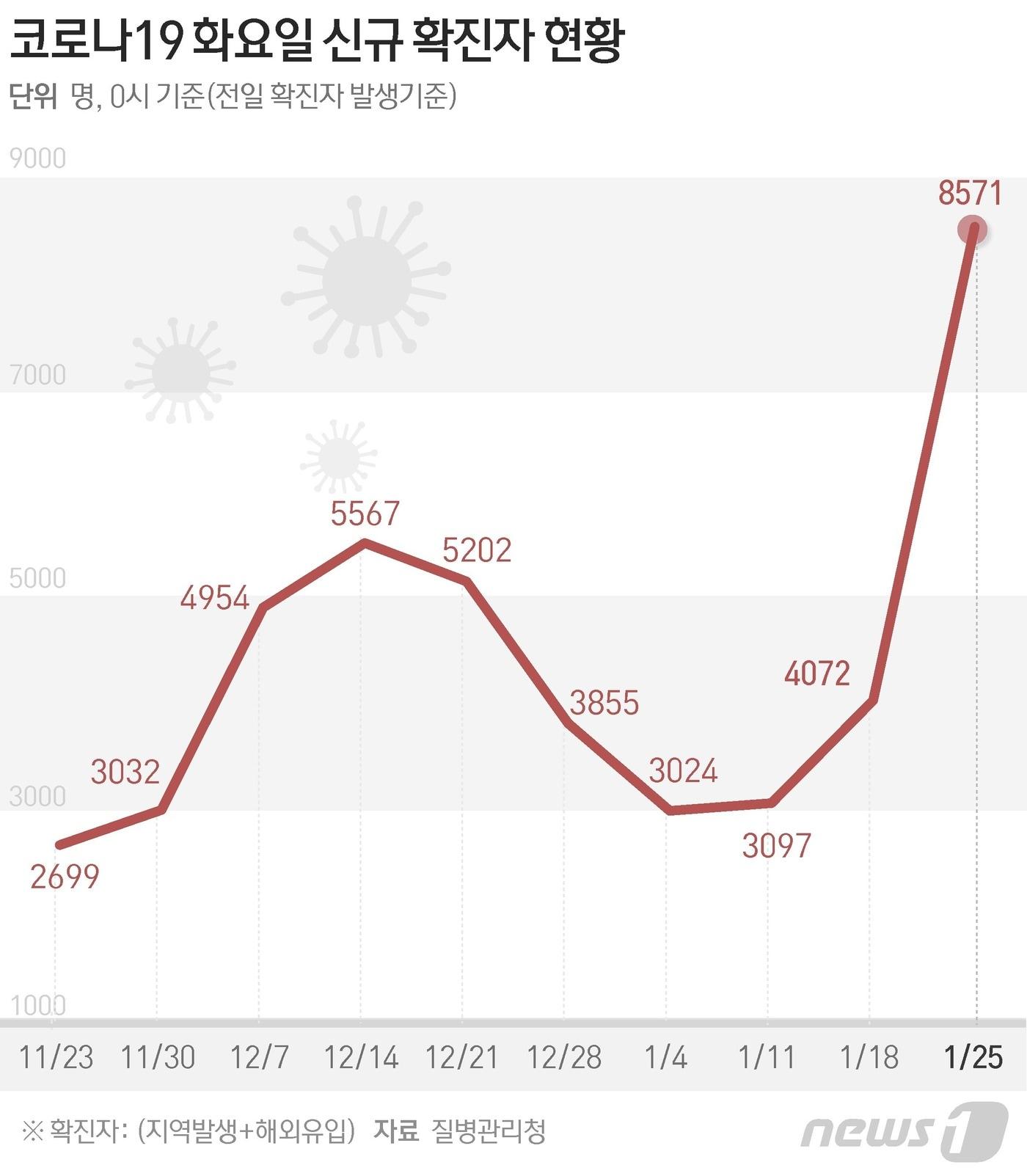질병관리청 중앙방역대책본부(방대본)는 25일 0시 기준 신종 코로나바이러스 감염증(코로나19) 신규 확진자가 8571명 발생했다고 밝혔다. ⓒ News1 윤주희 디자이너