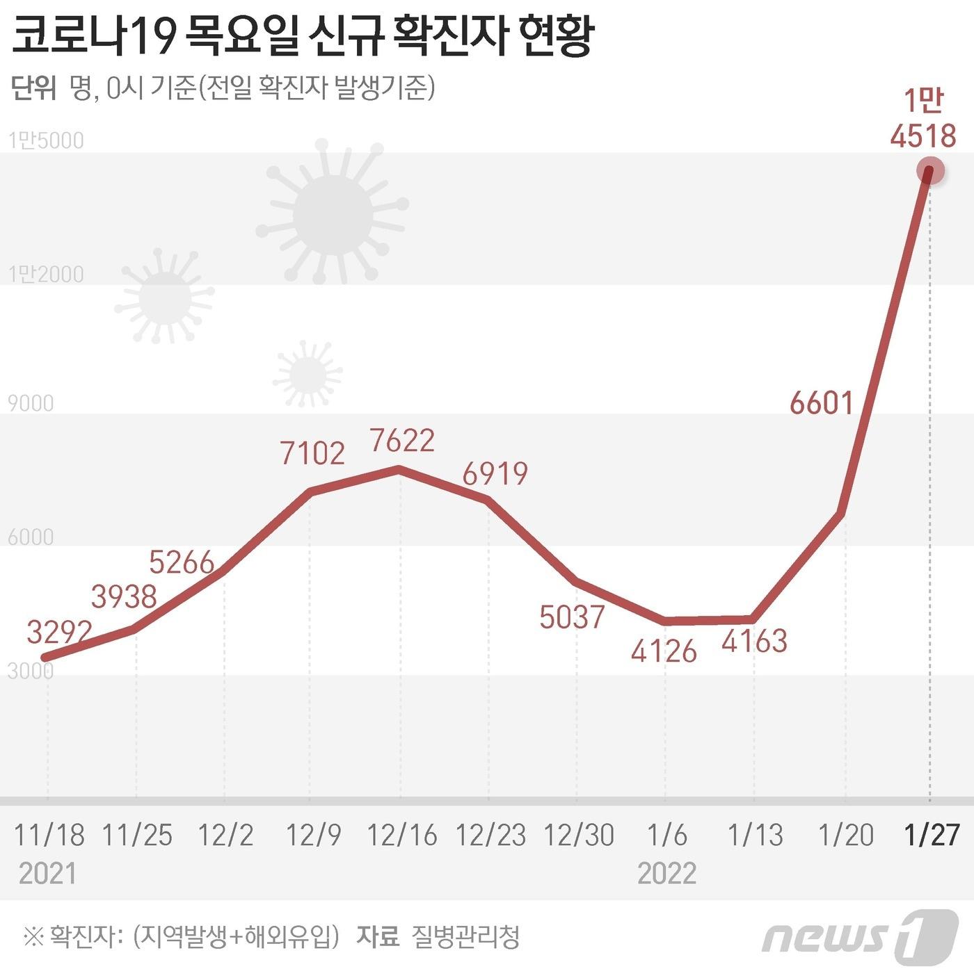 위중증 환자 350명, 전날보다 35명 줄어·사망 34명정부, 2월 3일부터 동네 병의원 검사·진료 전국 확대질병관리청 중앙방역대책본부(방대본)는 27일 0시 기준 신종 코로나바이러스 감염증(코로나19) 신규 확진자가 1만4518명 발생했다고 밝혔다. 이틀째 1만명대다. ⓒ News1 김초희 디자이너ⓒ News1 김초희 디자이너ⓒ News1 김초희 디자이너관련 키워드코로나19신종코로나권영미 기자 첫 女총리도 日스모 '금녀의 벽' 못넘어…다카이치, 시상식 불참"아직 살아있다"…8명 숨진 필리핀 쓰레기매립지 매몰자 수색 지속이형진 기자 계열사 앞에서 끌던 SPC, 상미당홀딩스 전환으로 글로벌 후방 지원"'두바이 스초생'은 어떤 맛일까"…투썸플레이스 "출시 긍정 검토"관련 기사2024년 재난 사망·실종 387명…재산피해 1조418억 달해스포츠산업 매출액 '84조7000억원' 역대 최대…종사자 46만명팬데믹 위기 대비 '백신 신속도입 범정부 협의체' 설치된다"코로나19 확산 대응 못한 죄?"…전 中우한시장 당적·공직 박탈다시 화두 오른 '고령자 운전'…"운전면허 반납제 지원 확대해야"