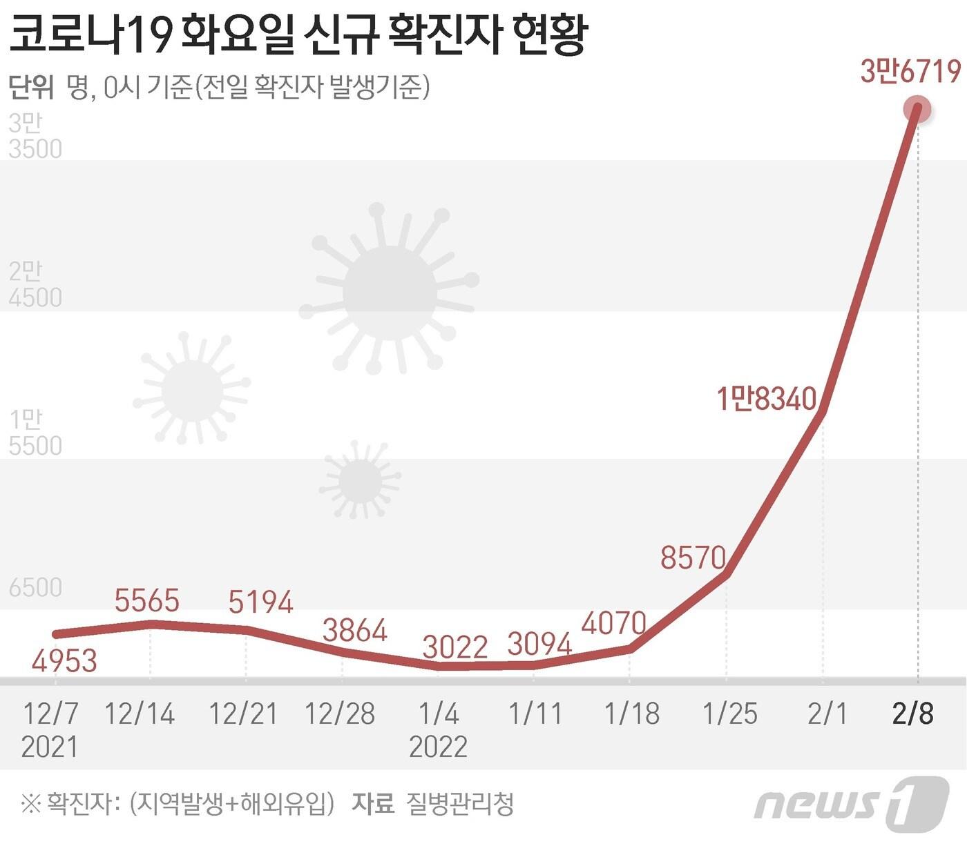 국내발생 3만6619명, 해외유입 100명역대 두번째 확진자에 경기 등 4곳도 최다 경신질병관리청 중앙방역대책본부(방대본)는 8일 0시 기준 신종 코로나바이러스 감염증(코로나19) 신규 확진자가 3만6719명 발생했다고 밝혔다. 주말효과가 남아있어야 함에도 이날 확진자는 역대 두번째로 많고, 나흘째 3만명대를 이어가고 있다. 역대 최다 확진자 기록은 지난 6일의 3만8690명이다. ⓒ News1 김초희 디자이너ⓒ News1 김초희 디자이너ⓒ News1 김초희 디자이너관련 키워드코로나19코로나권영미 기자 다카이치 日총리 장남, 중의원 출마 결심…내달 조기총선 유력베네수엘라 증시, 마두로 체포 열흘만에 160% 폭등…경제회복 기대강승지 기자 예방 가능한 외상사망률 2년만에 13.9%→9.1%…한 자릿수 진입의대교수협 "증원 효과 10년 뒤 나타나…수가 정상화 등이 먼저"관련 기사박용선 경북도의원 "시민 행복·경제 회복 위해 포항시장 출마"원화 약세 배경은 통화량? 한국 GDP 대비 M2 153.8%, 미국의 2배작년 취업자 19.3만명↑…청년 실업률 6.1%·건설 12.5만명↓ '한파'(종합2보)국립보건연구원, 소아 마이코플라스마 폐렴 치료제 효과 비교 임상 개시지난해 취업자 19.3만명↑…청년 실업률 6.1% 팬데믹 이후 최고(종합)