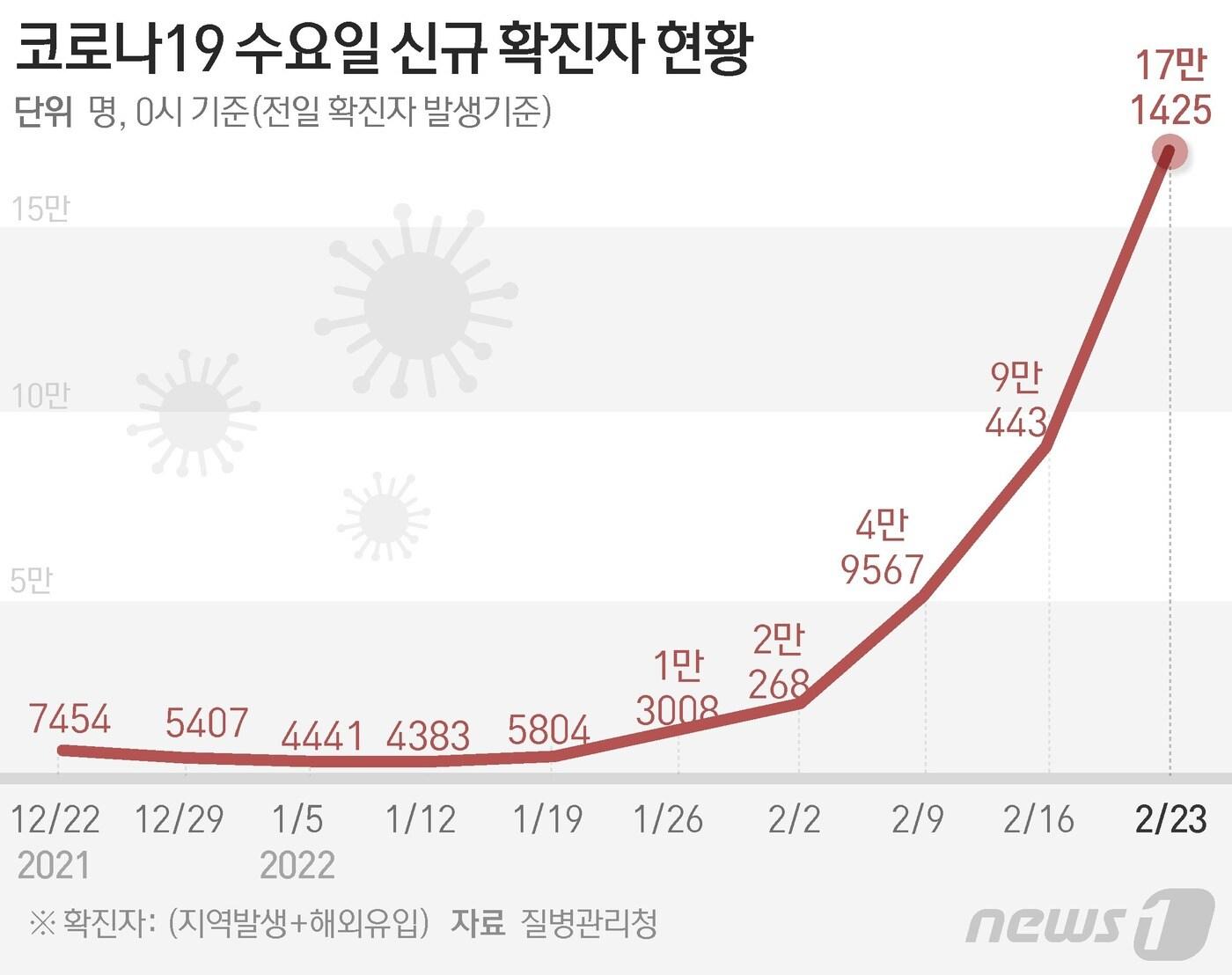 질병관리청 중앙방역대책본부(방대본)는 23일 0시 기준 신종 코로나바이러스 감염증(코로나19) 신규 확진자가 17만1452명 발생했다고 밝혔다. 주말 진단검사량 감소 효과가 끝나는 수요일이 되면서 전일(22일) 9만9573명보다 7만1879명 급증했다. 이전 역대 최다 확진 기록(18일, 10만9822명)보다 6만6130명 많은 기록이다. ⓒ News1 김초희 디자이너