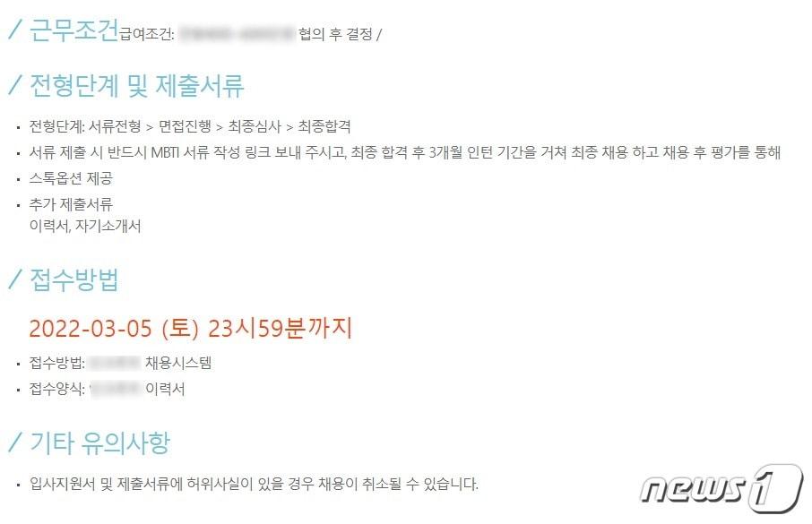 활용하는 기업 늘었지만 "과학적이지 않다" 비판MBTI 재단도 "채용시에 활용하는 것은 비윤리적" 경고1일 오전 한 구인·구직관련 사이트에 올라온 채용정보. '반드시 MBTI 서류를 작성해 제출할 것'을 명시하고 있다. ⓒ 뉴스1박동해 기자 '공천헌금' 김병기 전방위 압색…'아내 법카' 수사팀장 소환(종합2보)마약합수단 파견 백해룡 경정 복귀…경찰 "새 수사팀 檢 파견"