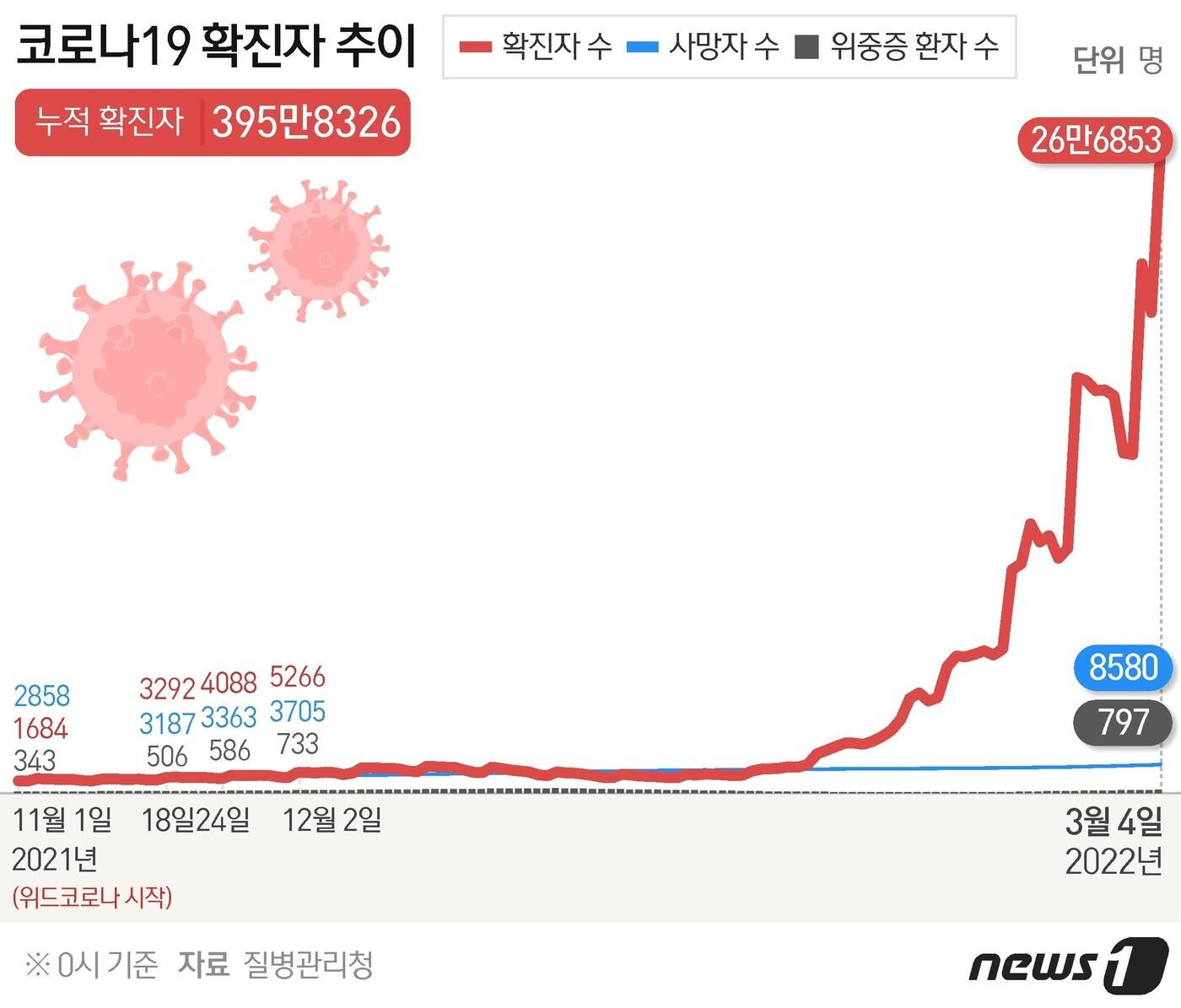본문 이미지 - 질병관리청 중앙방역대책본부(방대본)는 4일 0시 기준 신종 코로나바이러스 감염증(코로나19) 신규 확진자가 26만6853명 발생했다고 밝혔다. 국내 코로나19 유입 이후 가장 많은 일일 확진자 숫자다. ⓒ News1 김초희 디자이너