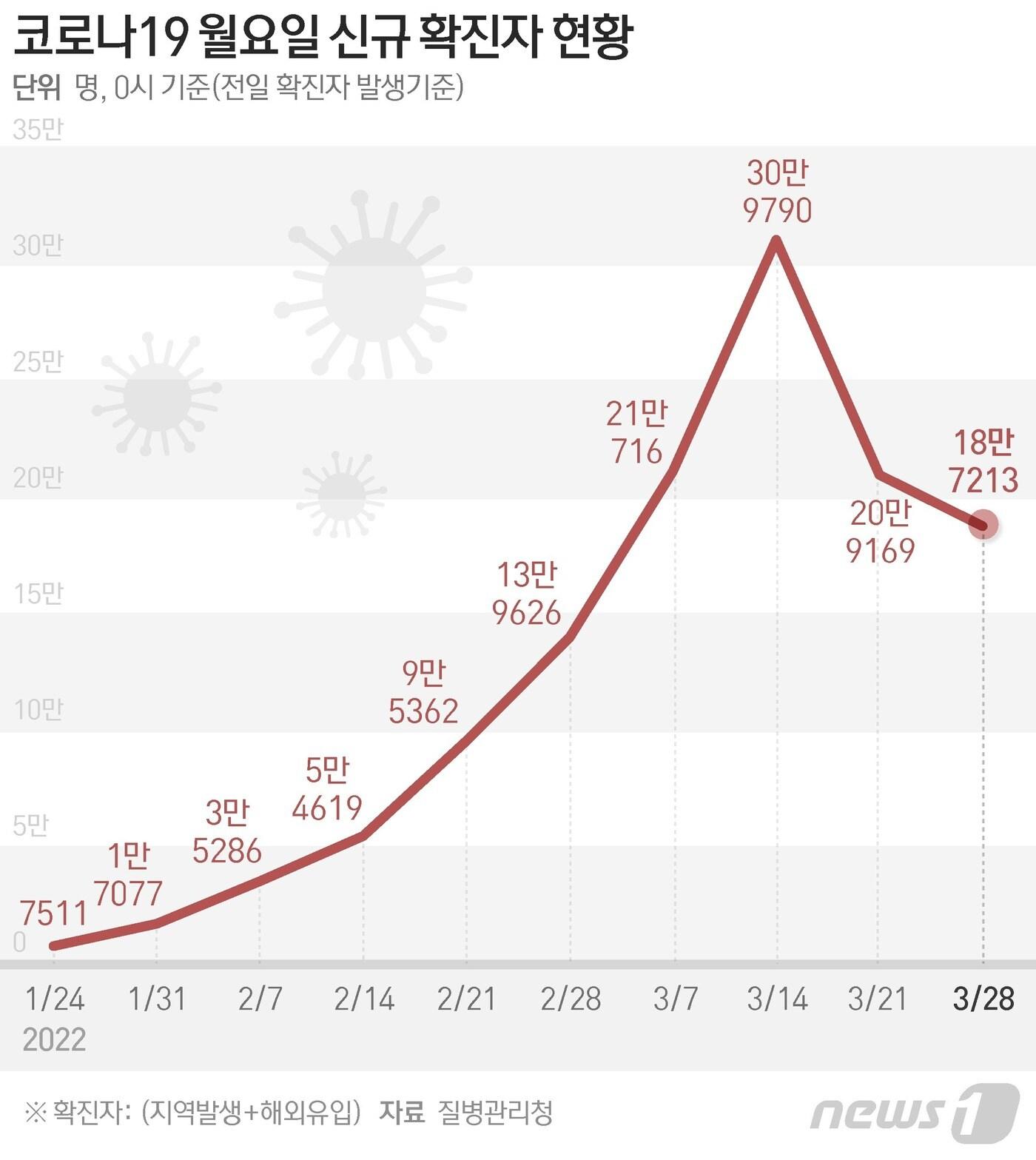 국내발생 18만7188명·해외유입은 25명으로 집계3차 접종 63.6%…노바백스 1차 누적 9만7534명질병관리청 중앙방역대책본부(방대본)는 28일 0시 기준 신종 코로나바이러스 감염증(코로나19) 신규 확진자가 18만7213명 발생했다고 밝혔다. 25일 만에 20만명 아래로 감소했다. ⓒ News1 최수아 디자이너ⓒ News1 최수아 디자이너ⓒ News1 최수아 디자이너관련 키워드코로나19이형진 기자 계열사 앞에서 끌던 SPC, 상미당홀딩스 전환으로 글로벌 후방 지원"'두바이 스초생'은 어떤 맛일까"…투썸플레이스 "출시 긍정 검토"김규빈 기자 실내 따뜻하다가 밖 나오면 위험…심혈관 환자 '아침 외출' 조심"잠들기 전 폰 못 놓는다"던 사람들, 생체리듬까지 흔들렸다관련 기사2024년 재난 사망·실종 387명…재산피해 1조418억 달해대전 1호선 일일수송승객 10만명 돌파…팬데믹 이전 수준 회복[단독] '아이유 효과 톡톡' 블랙야크, 5년간 동행 마무리테슬라 940만 원 '충격 인하'…새해 車 시장 가성비 전쟁 시작됐다'시각장애' 송승환 "안 보이는 삶, 더 많이 듣게 돼 좋아"[유튜버로 인생2막]