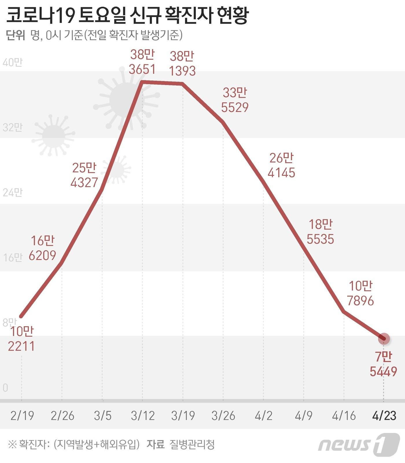 질병관리청 중앙방역대책본부(방대본)는 23일 0시 기준 신종 코로나바이러스 감염증(코로나19) 신규 확진자가 7만5449명 발생했다고 밝혔다. ⓒ News1 최수아 디자이너